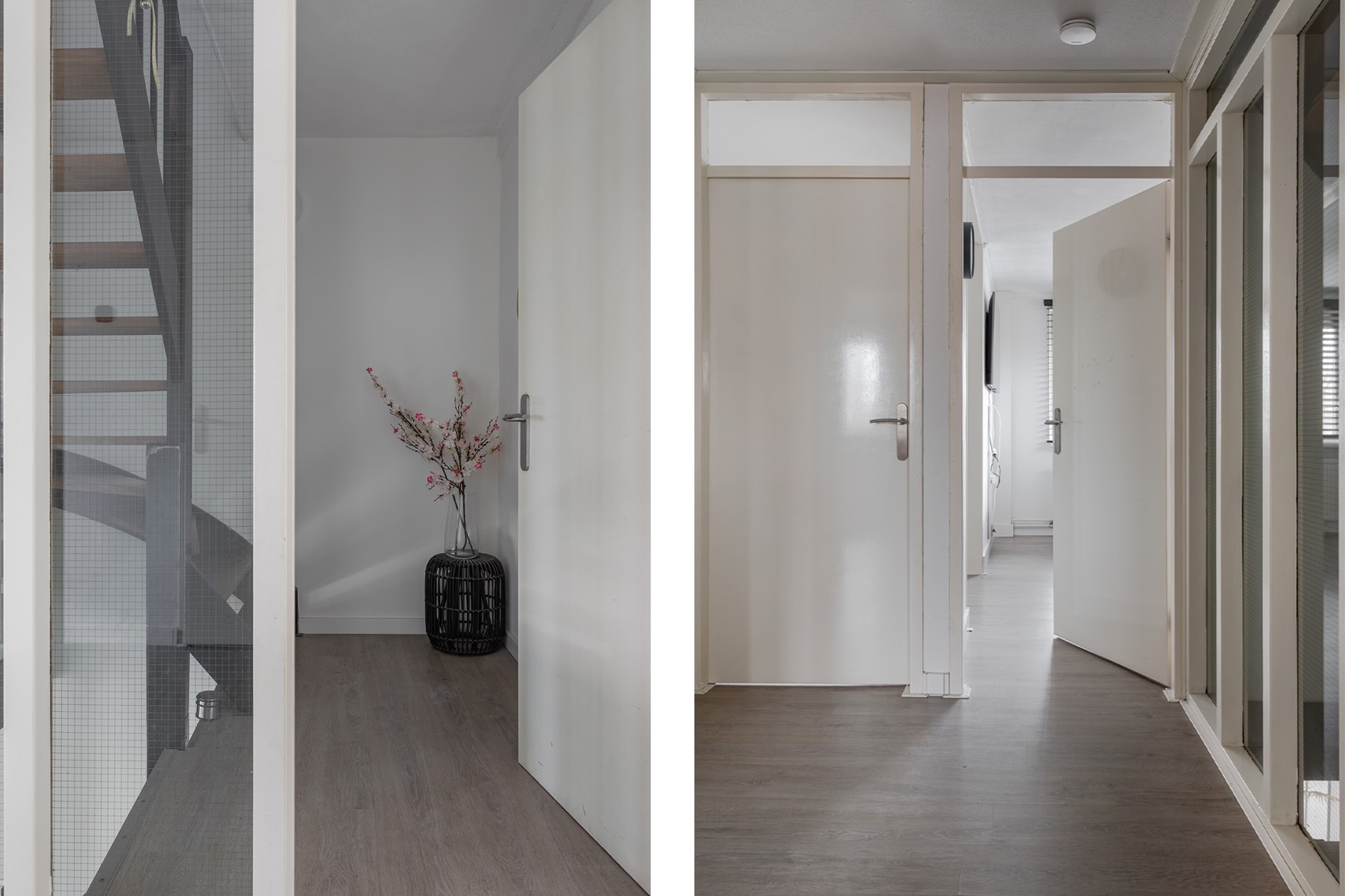 Via de open trap in de living heeft u toegang tot de afgesloten tussenhal op de slaapverdieping. Geluiden van beneden dringen niet door in de slaapkamers omdat het hele trappenhuis, ook naar de 2e verdieping is afgesloten door deuren en een raampartij. Op de overloop ligt laminaat op de betonnen verdiepingsvloer wat is doorgelegd in de slaapkamers.