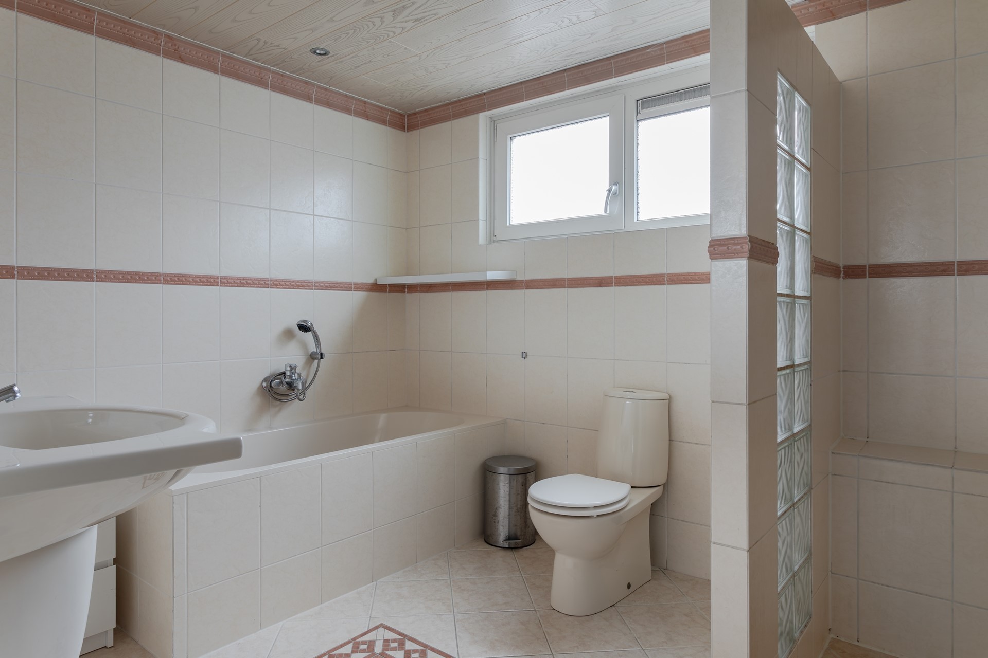 Een hele ruime badkamer met licht betegelde wanden en dito vloer. Hier loopt u elkaar niet in de weg……! De badkamer voorziet in een ligbad, 2e toilet, designradiator, wastafel met grote spiegel en een inloopdouche met thermostaatkraan en plateau om na een drukke dag even op te zitten als u een lange werkdag heeft gehad. In de zijwand zitten glasblokken voor een speels effect. Inbouwspots in het kunststof plafond verlichten de ruimte.
