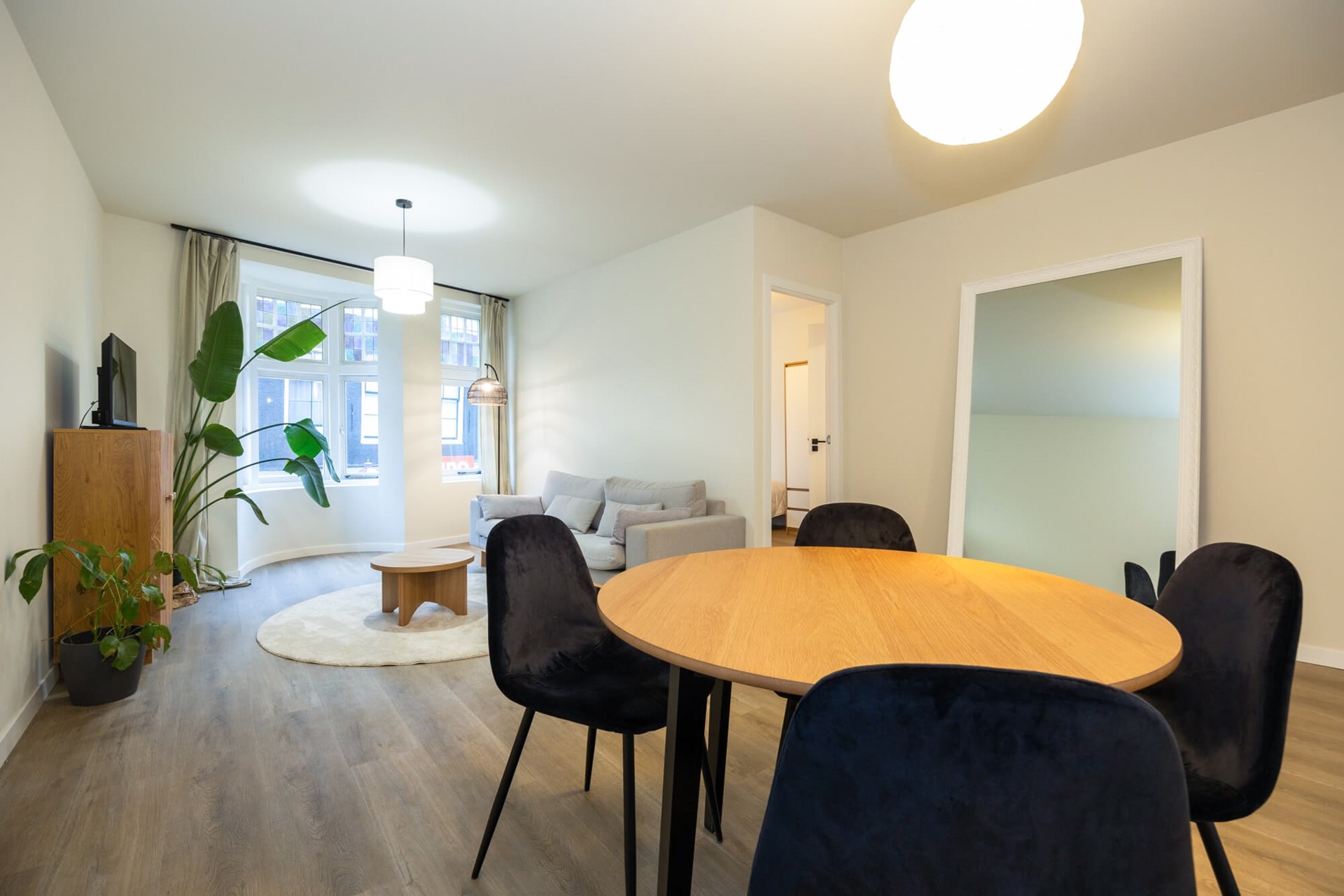 Ruime en sfeervolle living met stijlvolle erker met glas-in-lood in de bovenramen en zicht op de Nieuwe Noord. De wanden zijn gesausd en er ligt een pvc-vloer met vloerverwarming wat ook de hoofdverwarming is. Openslaande deuren geven toegang tot het dakterras en de wasmachine (die bij het appartement geleverd wordt) en CV staan in een ruime trapkast.