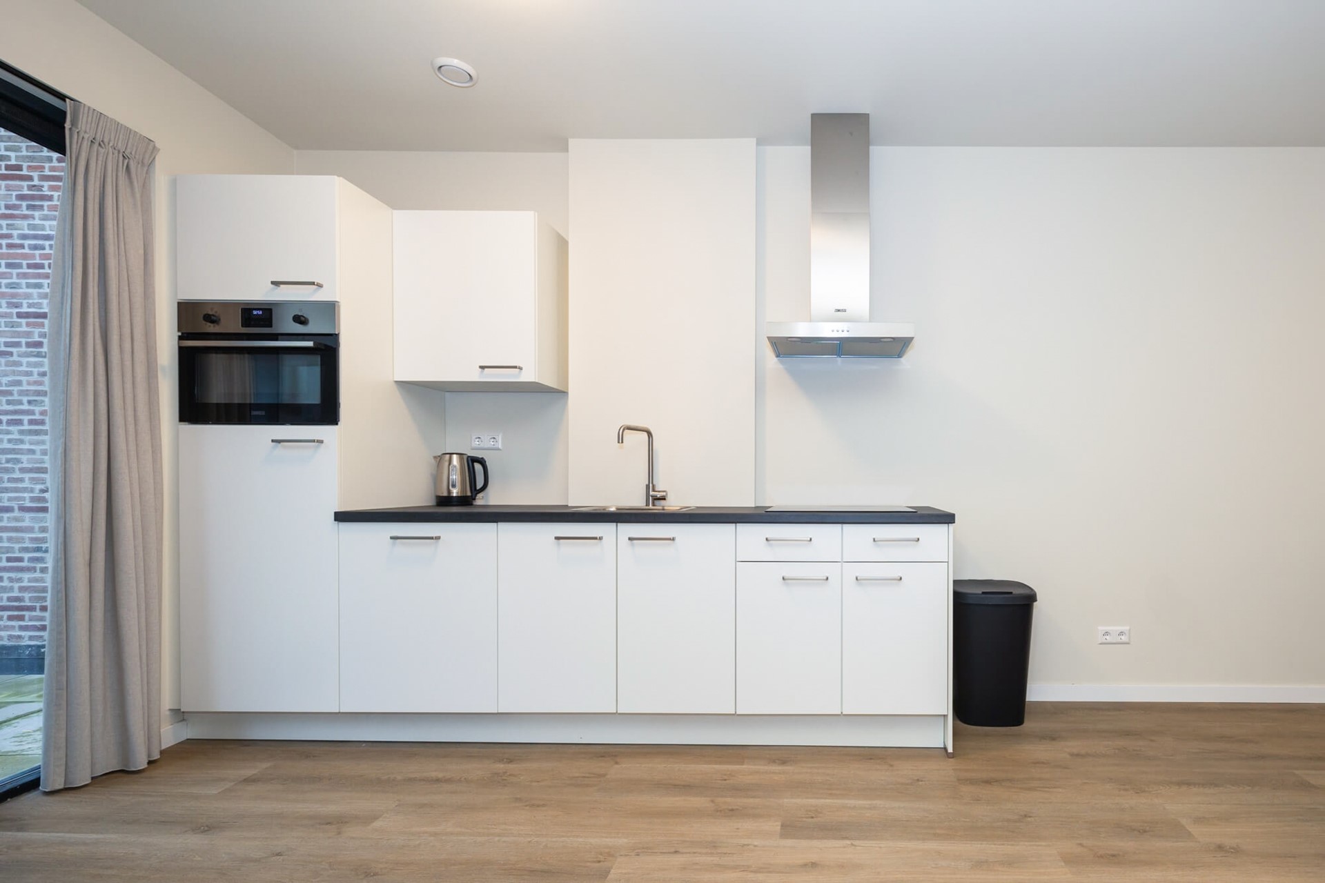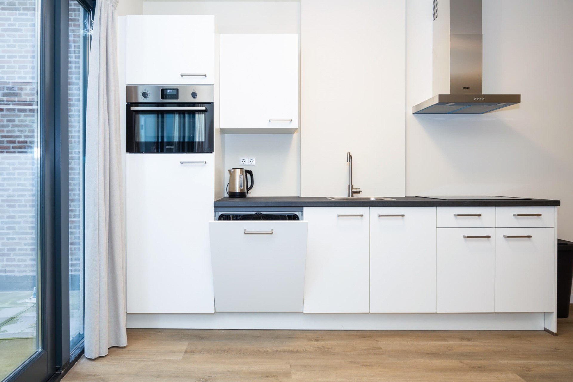 In 2024 is een moderne Sense keuken in lichte kleurstelling geplaatst met kastruimte, vaatwasser, inductie kookplaat, afzuigkap, combimagnetron en koelkast met vriesvakje. Compleet dus!