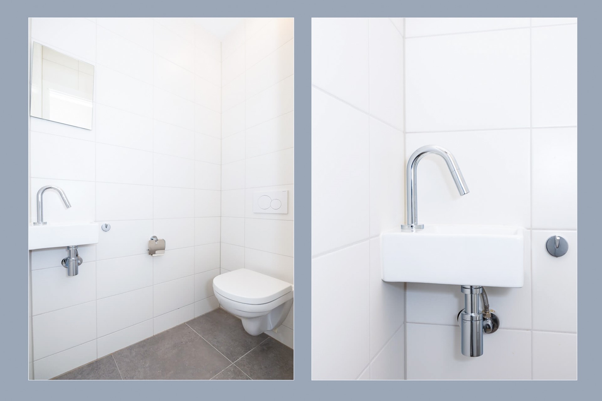 Naast de voordeur is het toilet met modern betegelde wanden, wandcloset, fonteintje en een centraal afzuigsysteem.