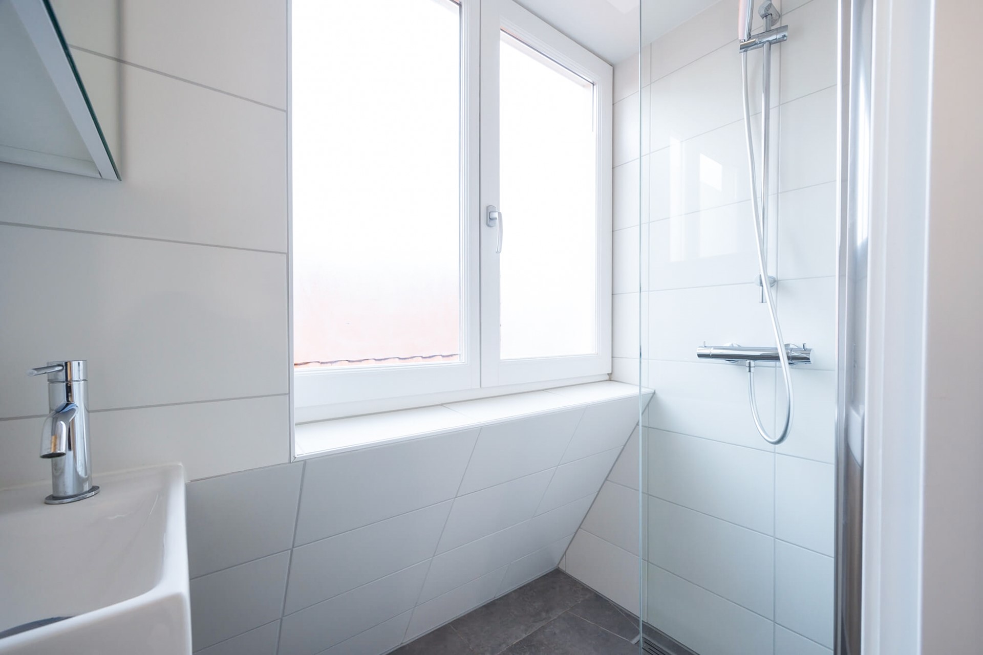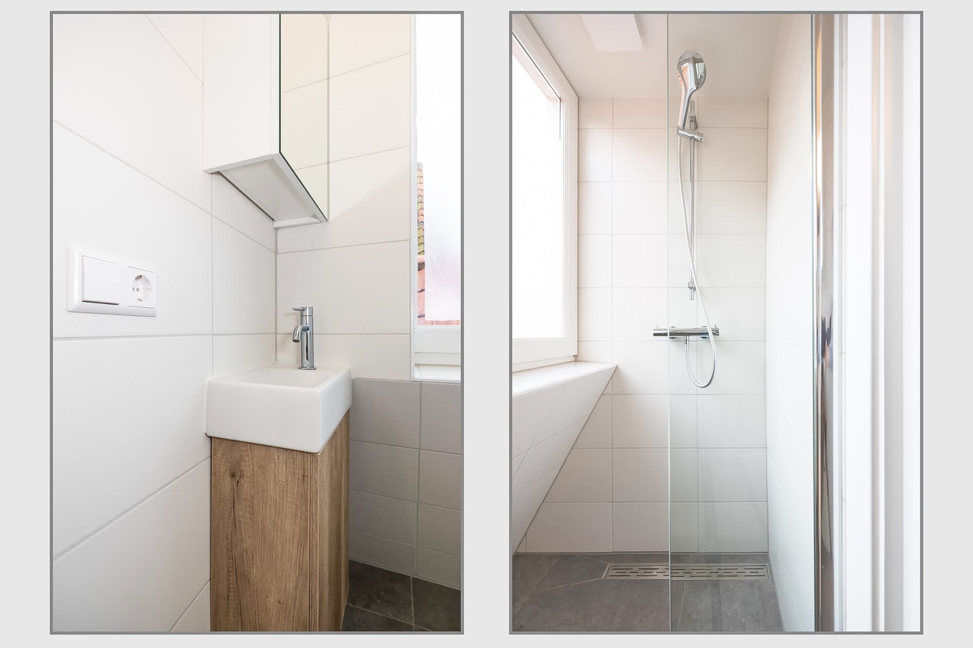 De badkamer heeft modern betegelde wanden en dito vloer, wastafelmeubel met kastje, spiegelkastje, een inloopdouche met thermostaatkraan en drainafvoer, een elektrische sierradiator, centraal afzuigsysteem en een stopcontact voor bijvoorbeeld het opladen van de elektrische tandenborstel. Er is een dakkapel met een vast én een draai/kiepraam met HR++ glas, dus veel lichtinval en natuurlijke ventilatie.