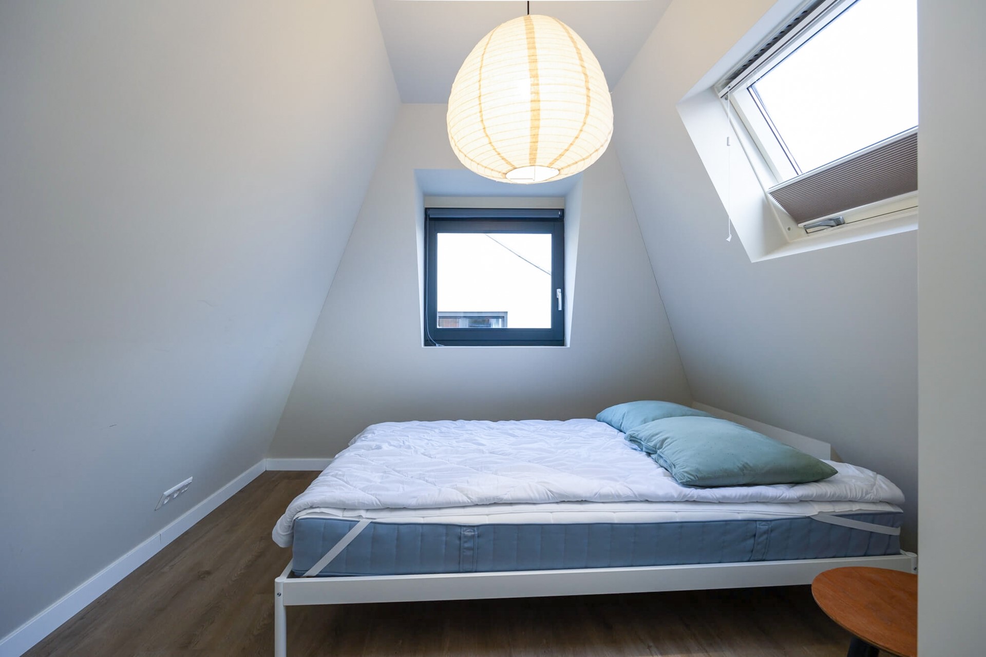 Knusse slaapkamer waar de pvc-vloer met vloerverwarming is doorgelegd en ook in dit vertrek zijn de wanden gesausd. Naast het draai/kiep raam aan de achterzijde is er nog een brede dakraam met verduisteringsgordijn.