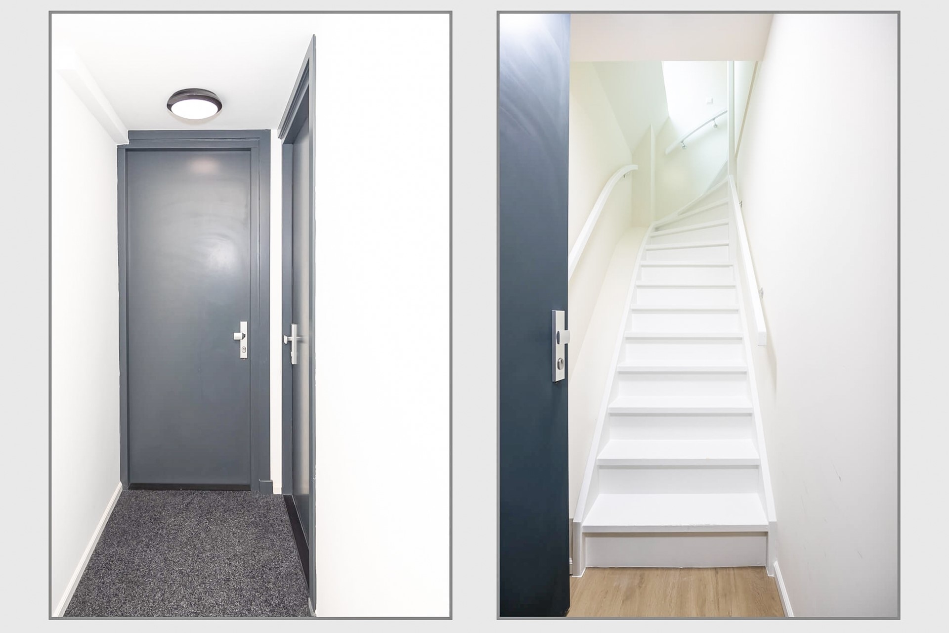 Gezamenlijke entree met een nette diepe hal. De wanden zijn gesausd en op de vloer ligt donkere vloerbedekking. In de hal op de begane grond is er voor ieder appartement een eigen meterkast en een hoge trap geeft toegang tot een tussenverdieping met toegang tot het appartement.