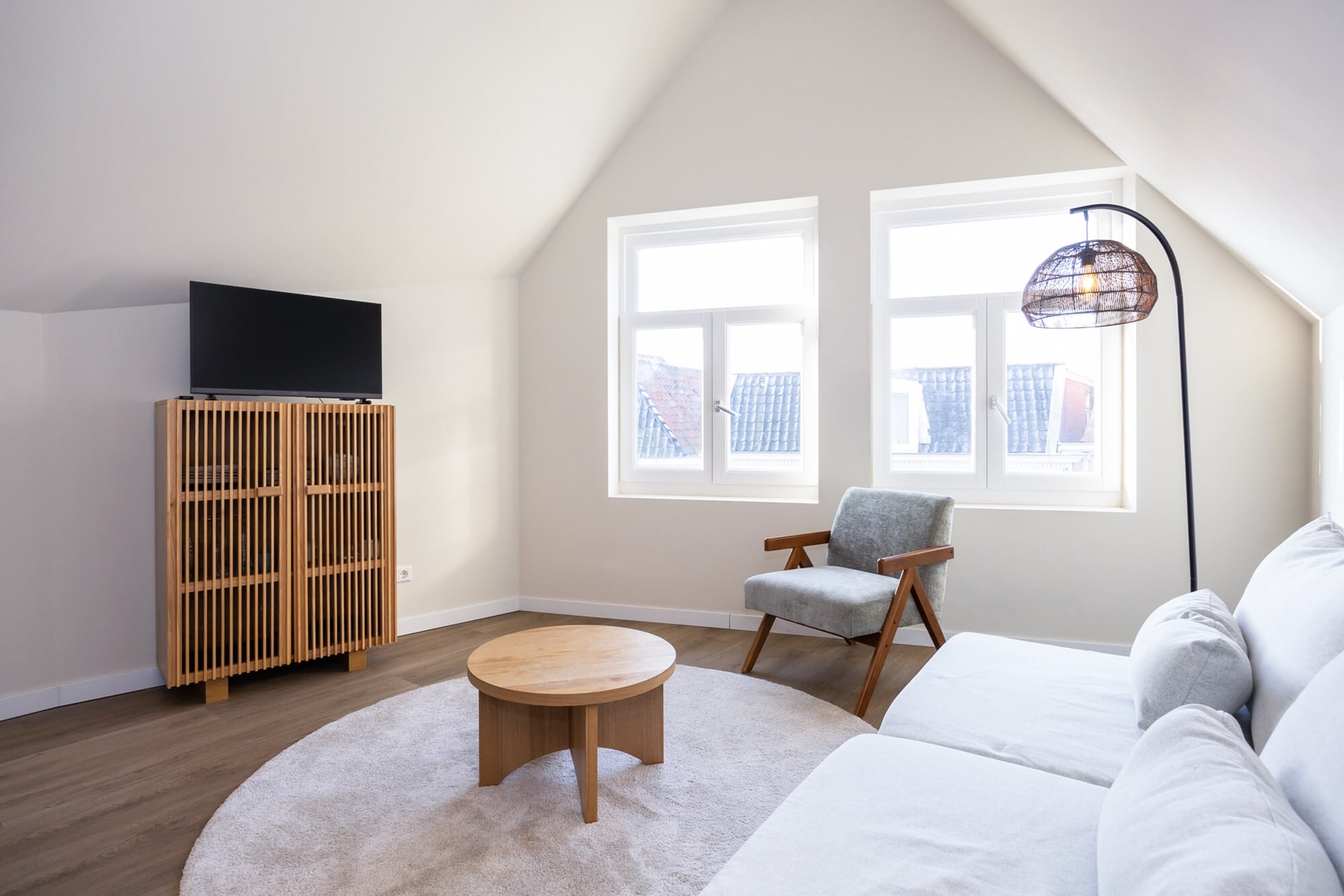 Ruime living met licht schuine wanden en hoog plafond onder het geïsoleerde dak en draai/kiepramen met zicht op de Grote Noord. Een dakraam geeft extra lichtinval en mogelijkheid om te ventileren. Op de vloer ligt pvc met vloerverwarming wat als hoofdverwarming in het gehele appartement is gelegd.