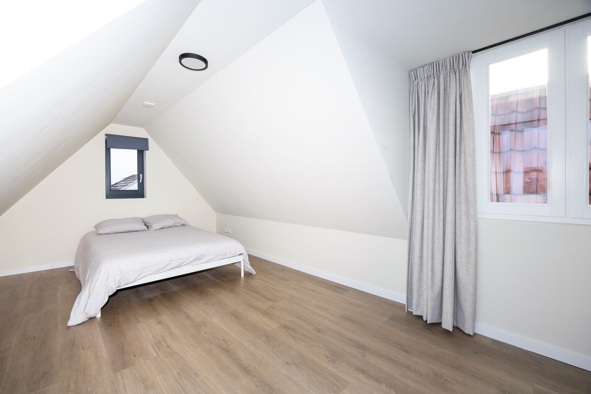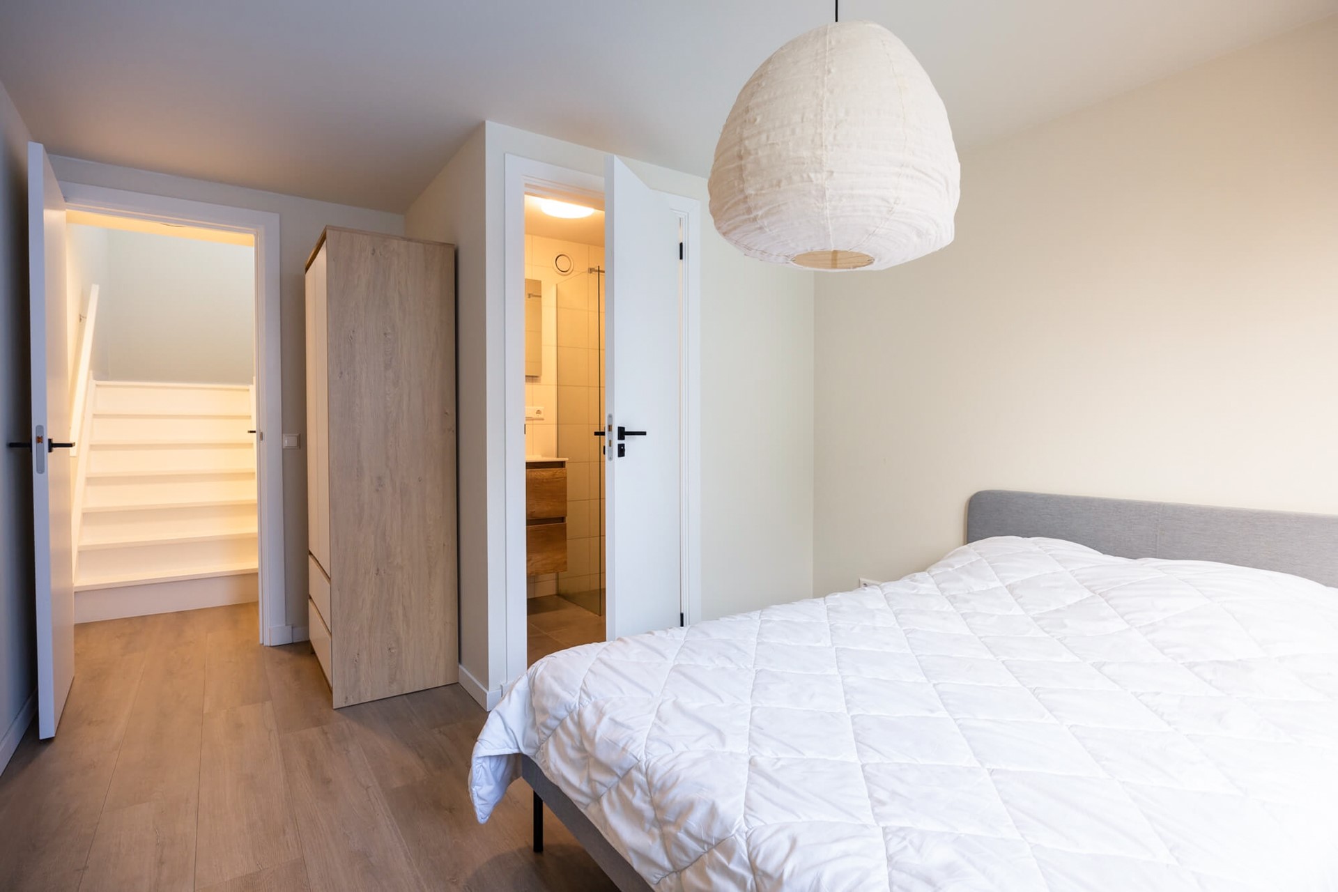 2e Slaapkamer - voor deze slaapkamer loop je een paar treden naar “beneden” naar een ruime slaapkamer met recht opgetrokken wanden en-suite badkamer. Ook deze kamer heeft een pvc-vloer met vloerverwarming en HR++ glas in de raampartij.