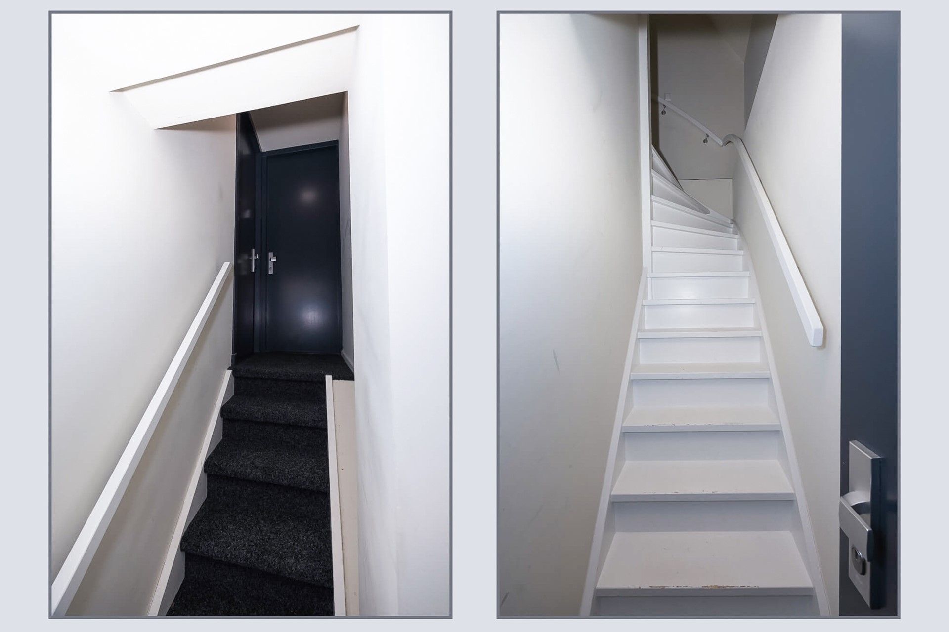 Gezamenlijke entree met een nette diepe hal. De wanden zijn gesausd en op de vloer ligt donkere vloerbedekking. In de hal op de begane grond is er voor ieder appartement een eigen meterkast en een hoge trap geeft toegang tot een tussenverdieping met het dakterras. Via dit dakterras is 57-E boven aan de trap te bereiken.