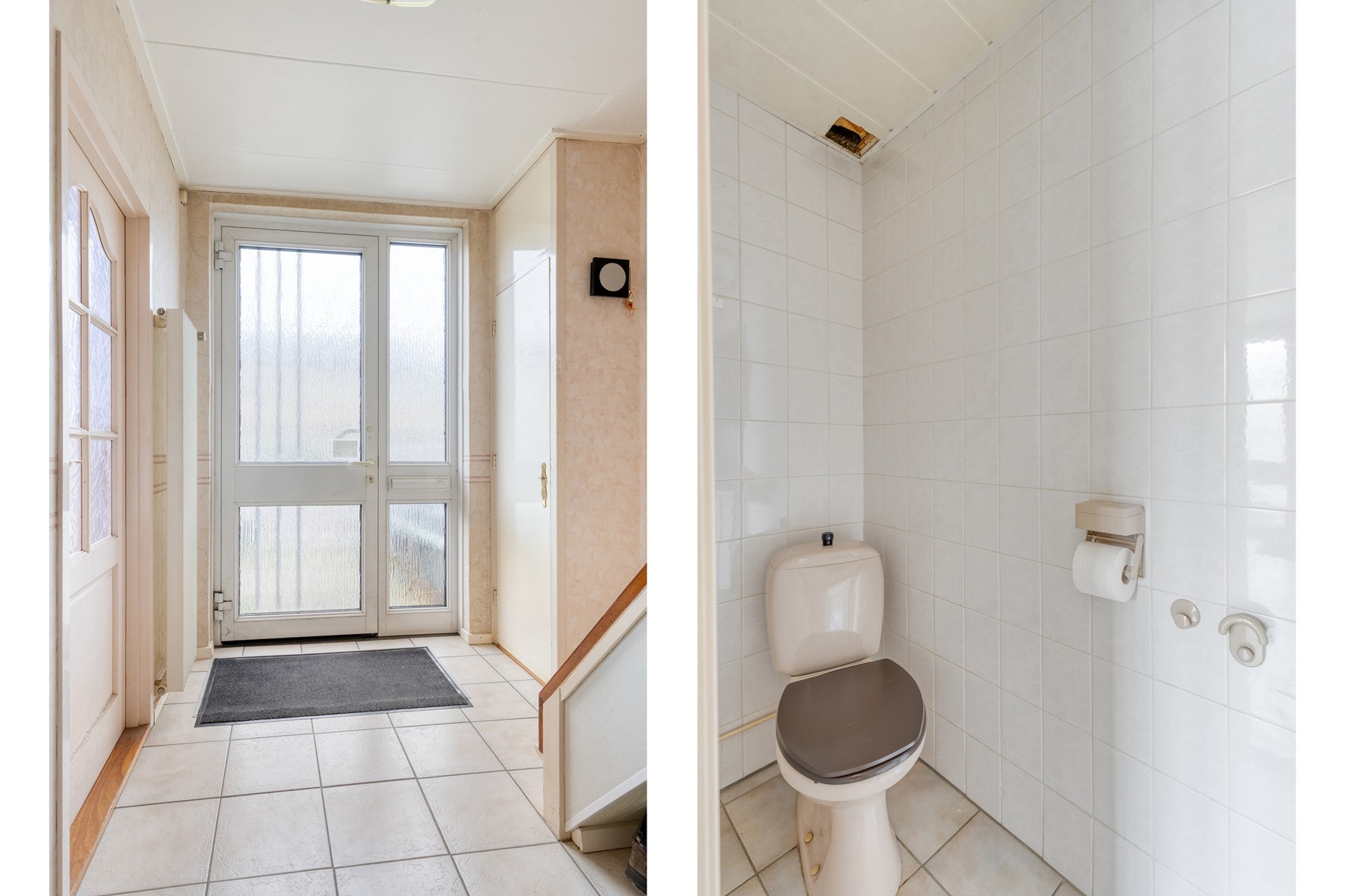 Fijne ruime hal met deuren naar de grote! toiletruimte met fonteintje en kast, meterkast en woonkamer. De trap naar de eerste verdieping vindt u ook in de hal.