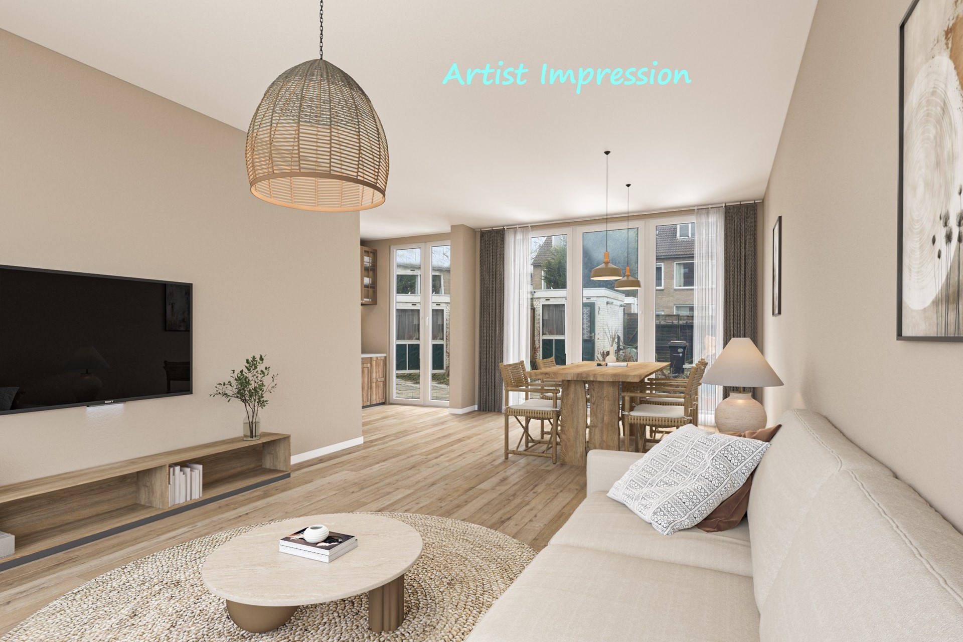 De doorzon-woonkamer is lekker lang (7,37 meter) en licht, vanwege de kamerbrede ramen aan de voor- en achterzijde. Aan de achterzijde loopt u via de kunststof schuifpui de achtertuin in. Op de Artist Impression ziet u hoe leuk het is om de wand tussen de woonkamer en de nu halfopen keuken deels te verwijderen, zodat een mooie open leefruimte ontstaat!