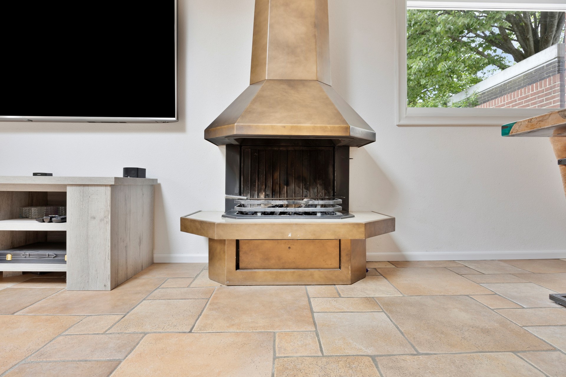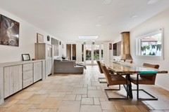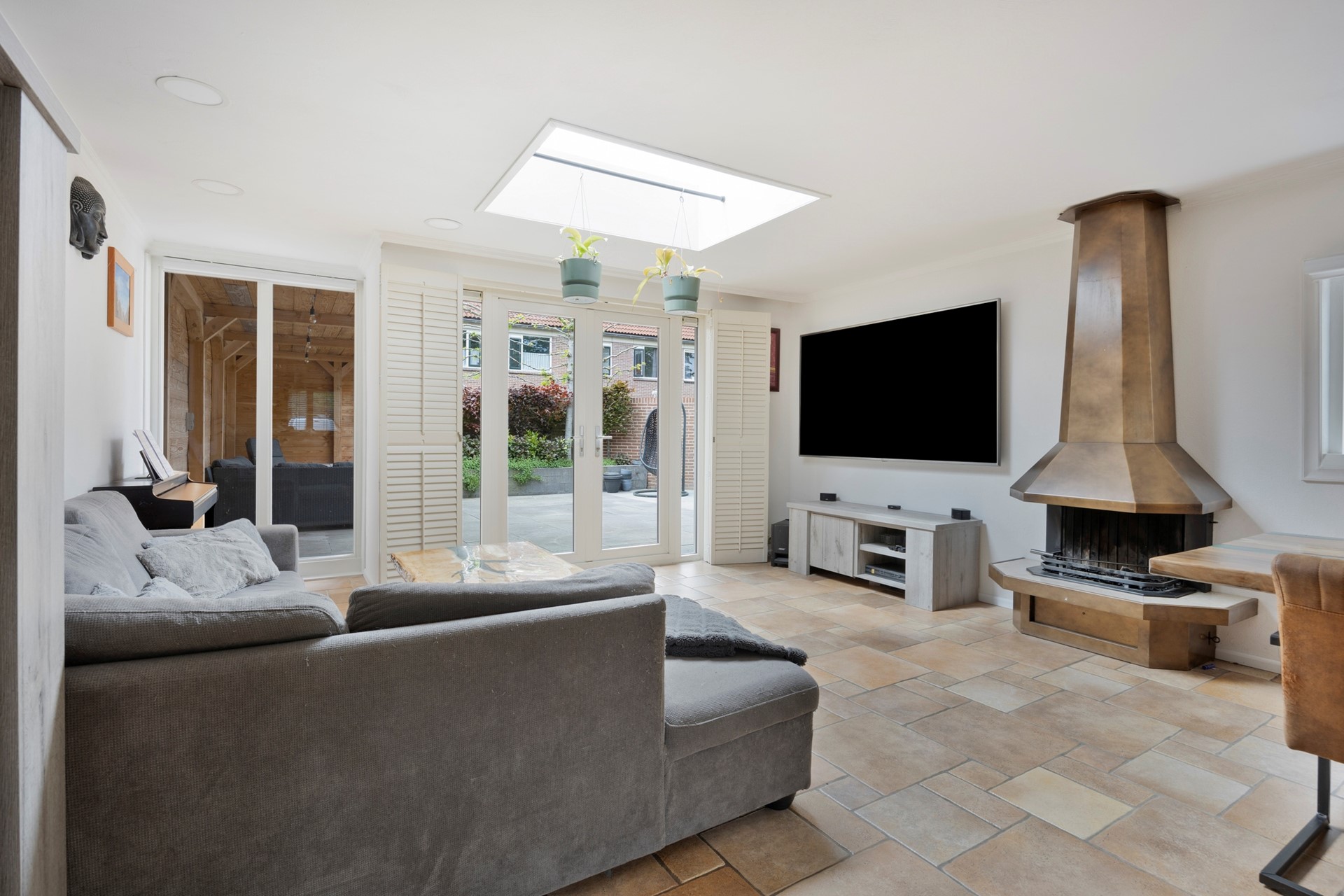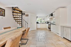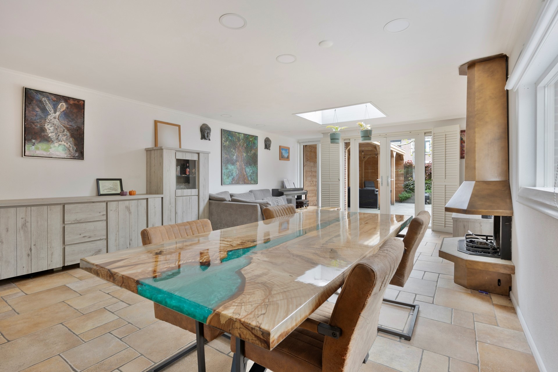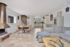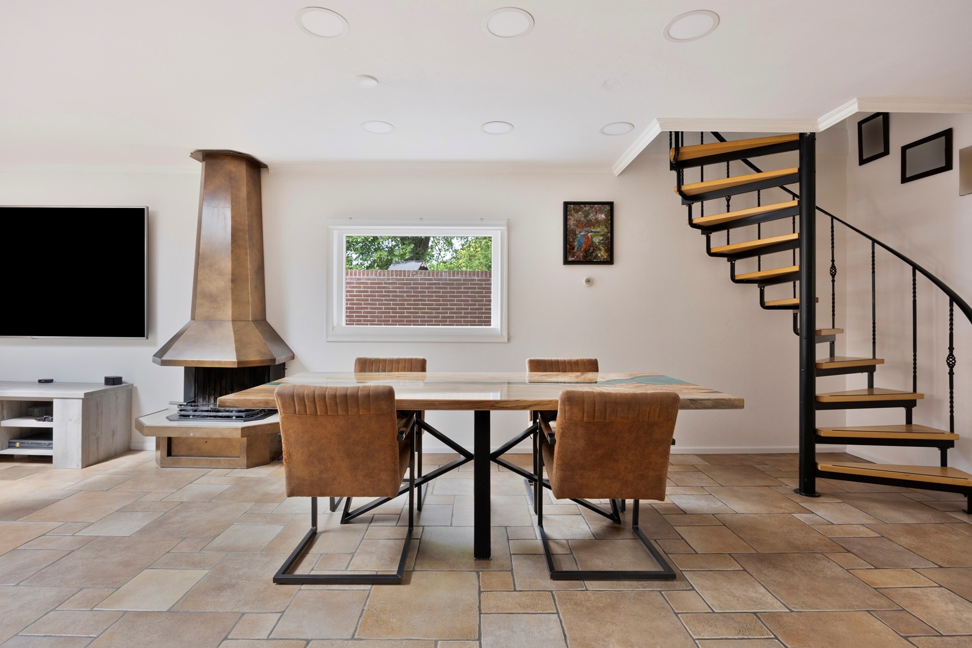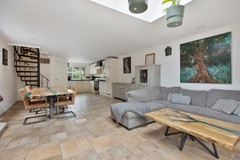 Geweldige living met giga oppervlakte! Aan de achterzijde heeft u meer dan voldoende ruimte om een grote zithoek te plaatsen. De kunststof openslaande tuindeuren met houten shutters staan erg sjiek! Op de vloer ligt een speels gelegde natuurstenen vloer in diverse formaten, voorzien van vloerverwarming (gehele begane grond!). De uitbouw is voorzien van een grote lichtkoepel, dat zorgt voor lekker veel natuurlijke lichtinval. Ook het brede zijraam (voordeel van een hoekwoning!) geeft de woonkamer een extra leuke sfeer. Het plafond is netjes gestuukt en voorzien van een sierlijst en inbouw ledverlichting. De houthaard staat garant voor gezellig warme winteravonden. Halverwege de woonkamer kunt u de allergrootste eettafel kwijt die u maar wenst! Heerlijk toch!