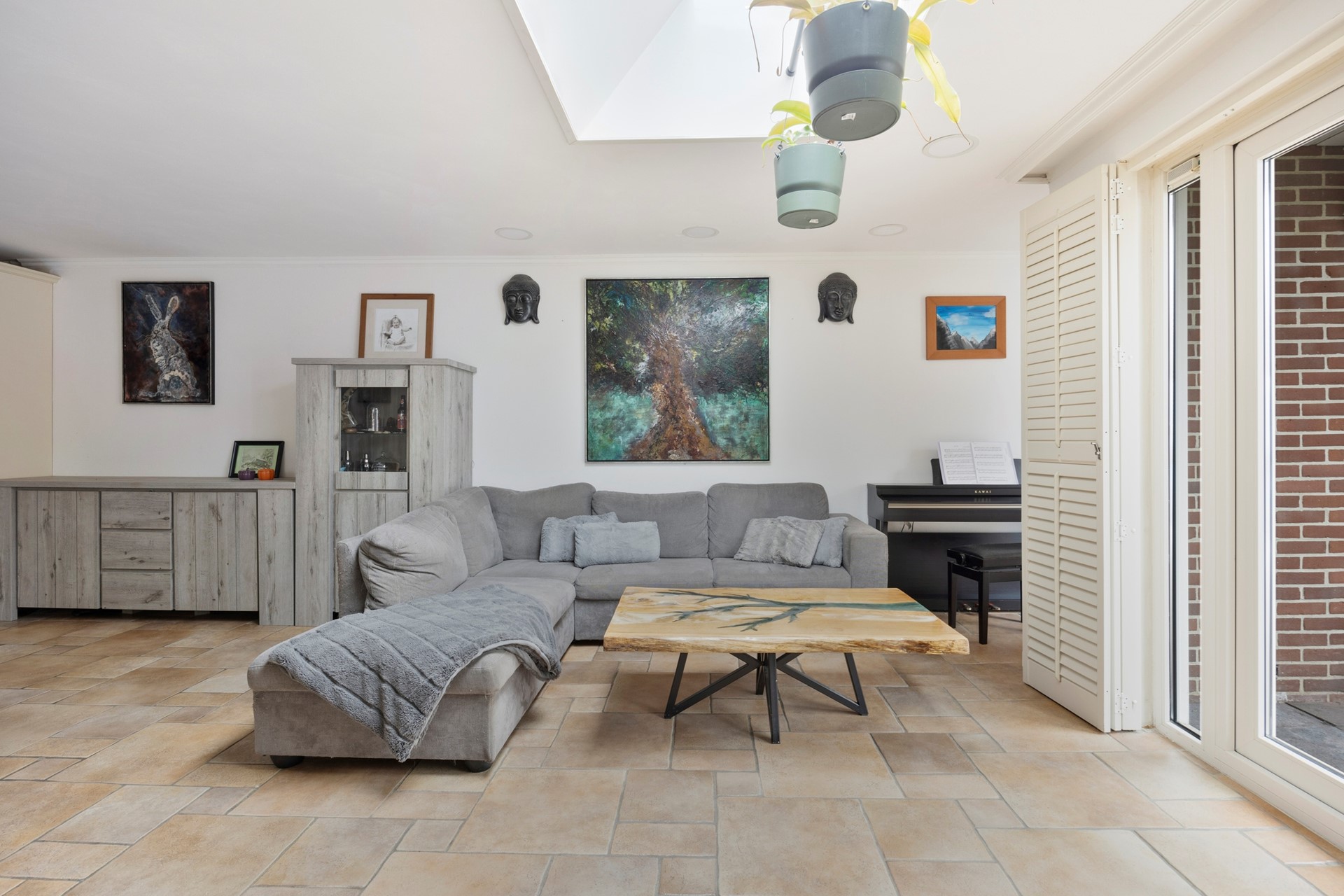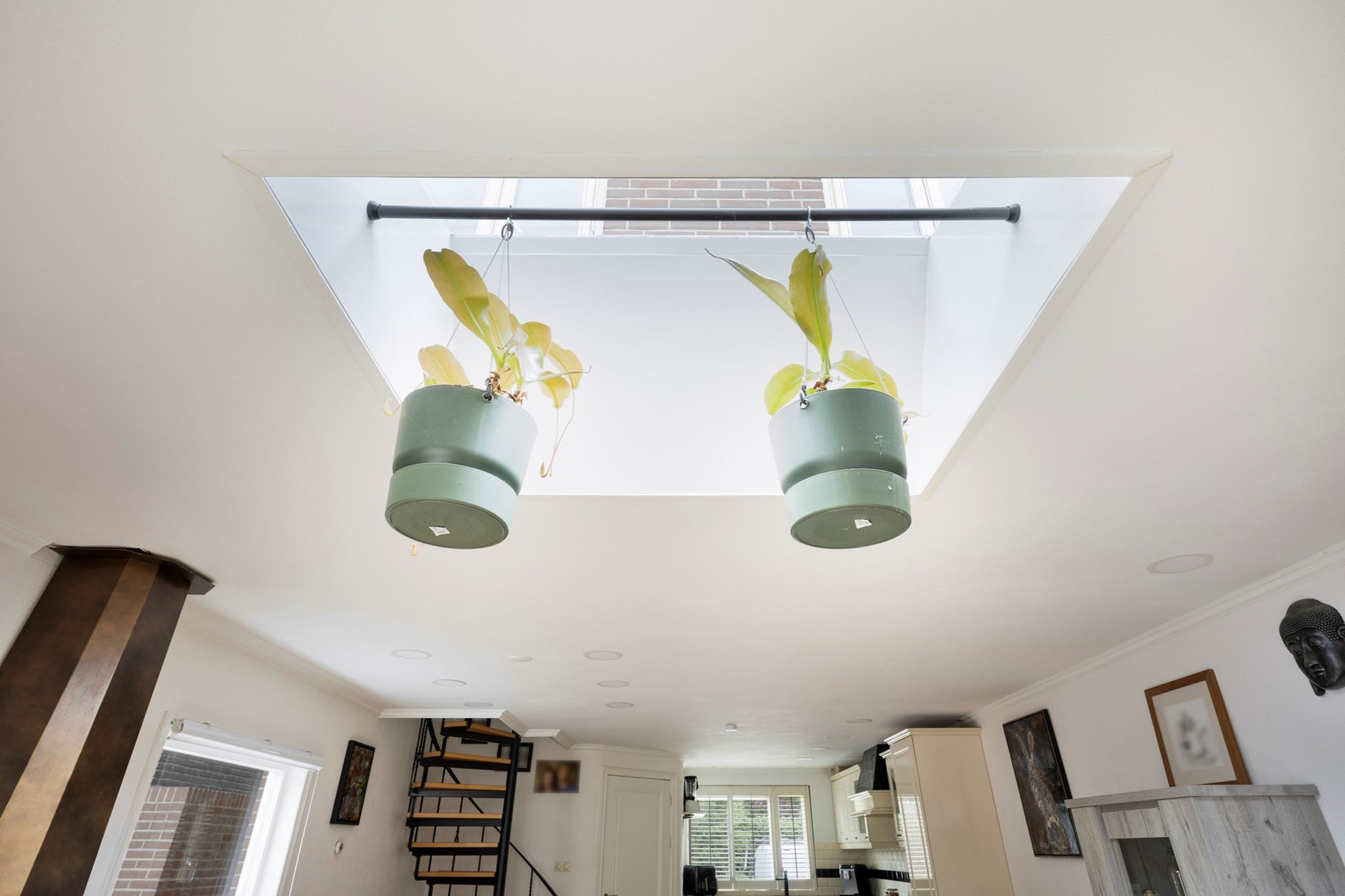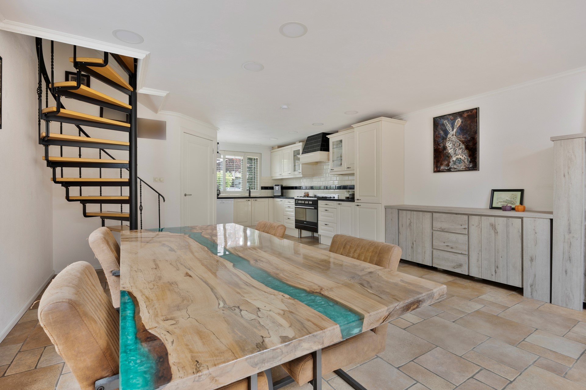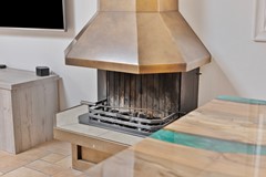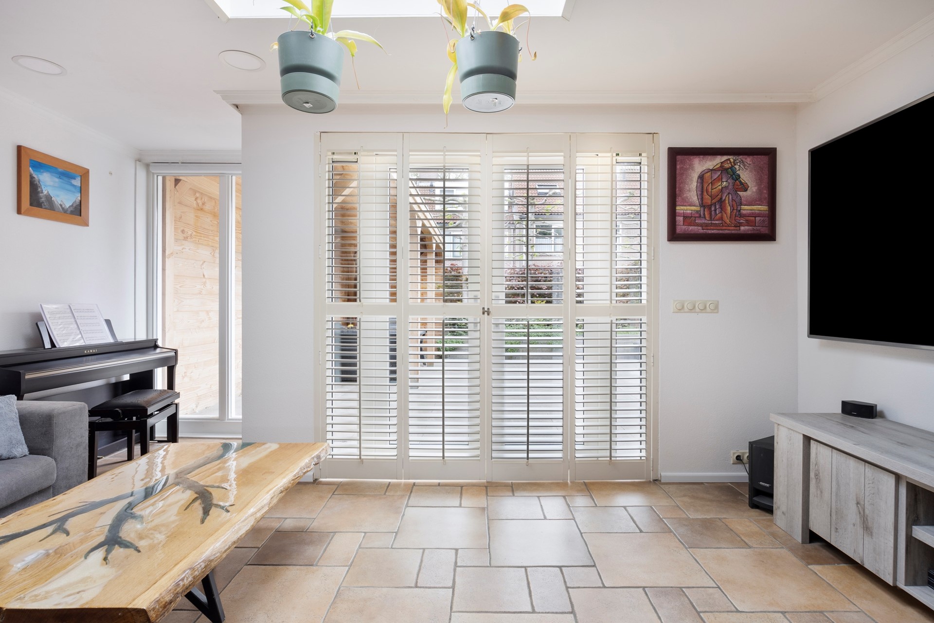 Geweldige living met giga oppervlakte! Aan de achterzijde heeft u meer dan voldoende ruimte om een grote zithoek te plaatsen. De kunststof openslaande tuindeuren met houten shutters staan erg sjiek! Op de vloer ligt een speels gelegde natuurstenen vloer in diverse formaten, voorzien van vloerverwarming (gehele begane grond!). De uitbouw is voorzien van een grote lichtkoepel, dat zorgt voor lekker veel natuurlijke lichtinval. Ook het brede zijraam (voordeel van een hoekwoning!) geeft de woonkamer een extra leuke sfeer. Het plafond is netjes gestuukt en voorzien van een sierlijst en inbouw ledverlichting. De houthaard staat garant voor gezellig warme winteravonden. Halverwege de woonkamer kunt u de allergrootste eettafel kwijt die u maar wenst! Heerlijk toch!