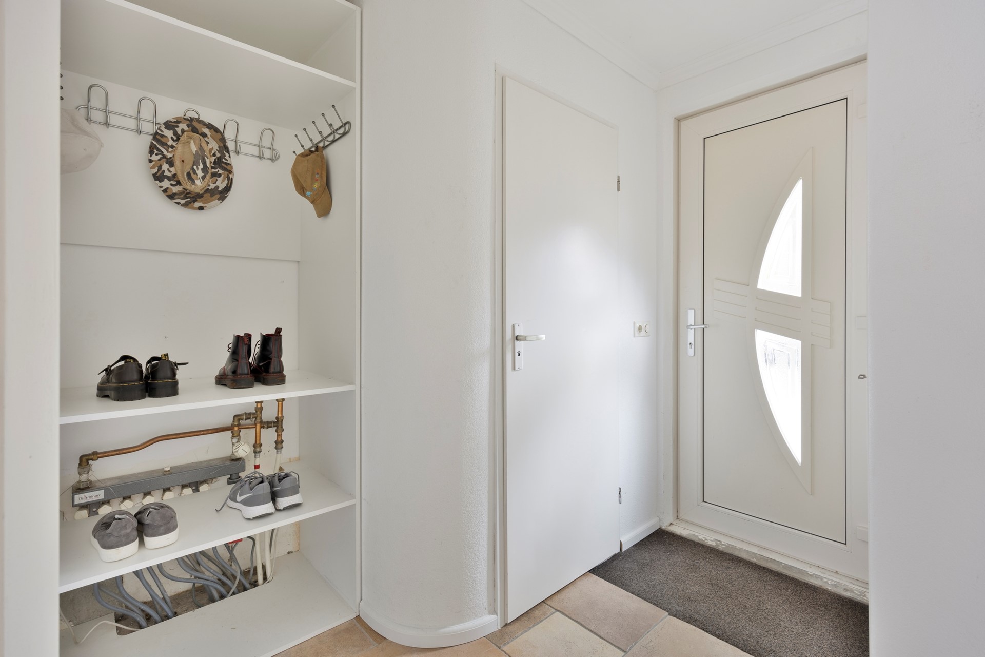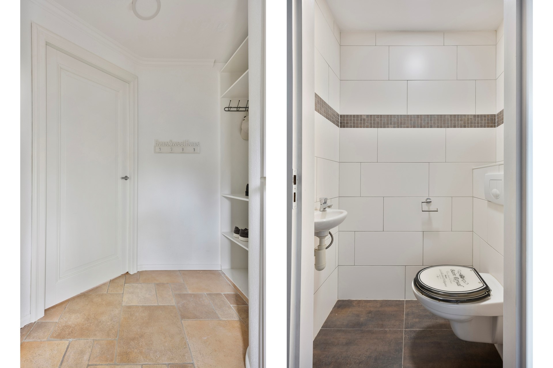 Ruime entree met deuren naar de moderne toiletruimte (met witte wandtegels, donkerbruin gemêleerde vloertegels , fonteintje en wandcloset), meterkast en woonkamer. In de open opbergkast is meer dan voldoende ruimte voor uw jassen en schoenen. Fijn is ook de kunststof voordeur met drie-punts veiligheidssluiting.