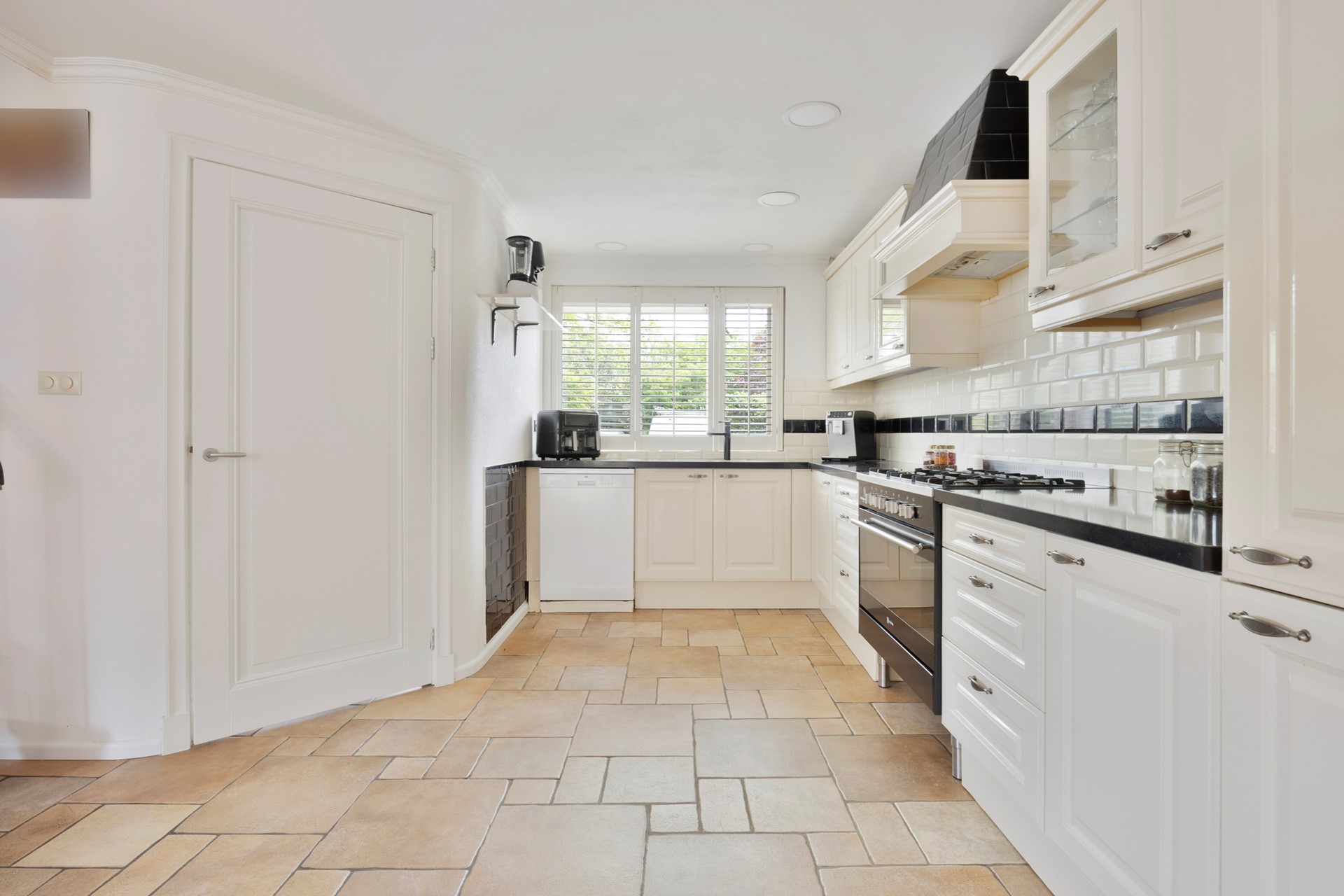 Grote open hoekkeuken aan de voorzijde van de woning met mooie houten shutters in het raam aan de voorzijde. De houten frontjes van de keuken zijn in hoogglans gelakt. Het kunststof zwarte werkblad is stijlvol onderbroken door een M-system zespits gasfornuis met oven. Verder is de keuken voorzien van een afzuigkap verwerkt in een kleine schouw, een koelkast met vriesgedeelte (3 laden) en een vaatwasser.