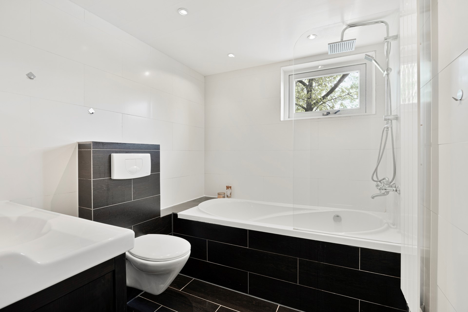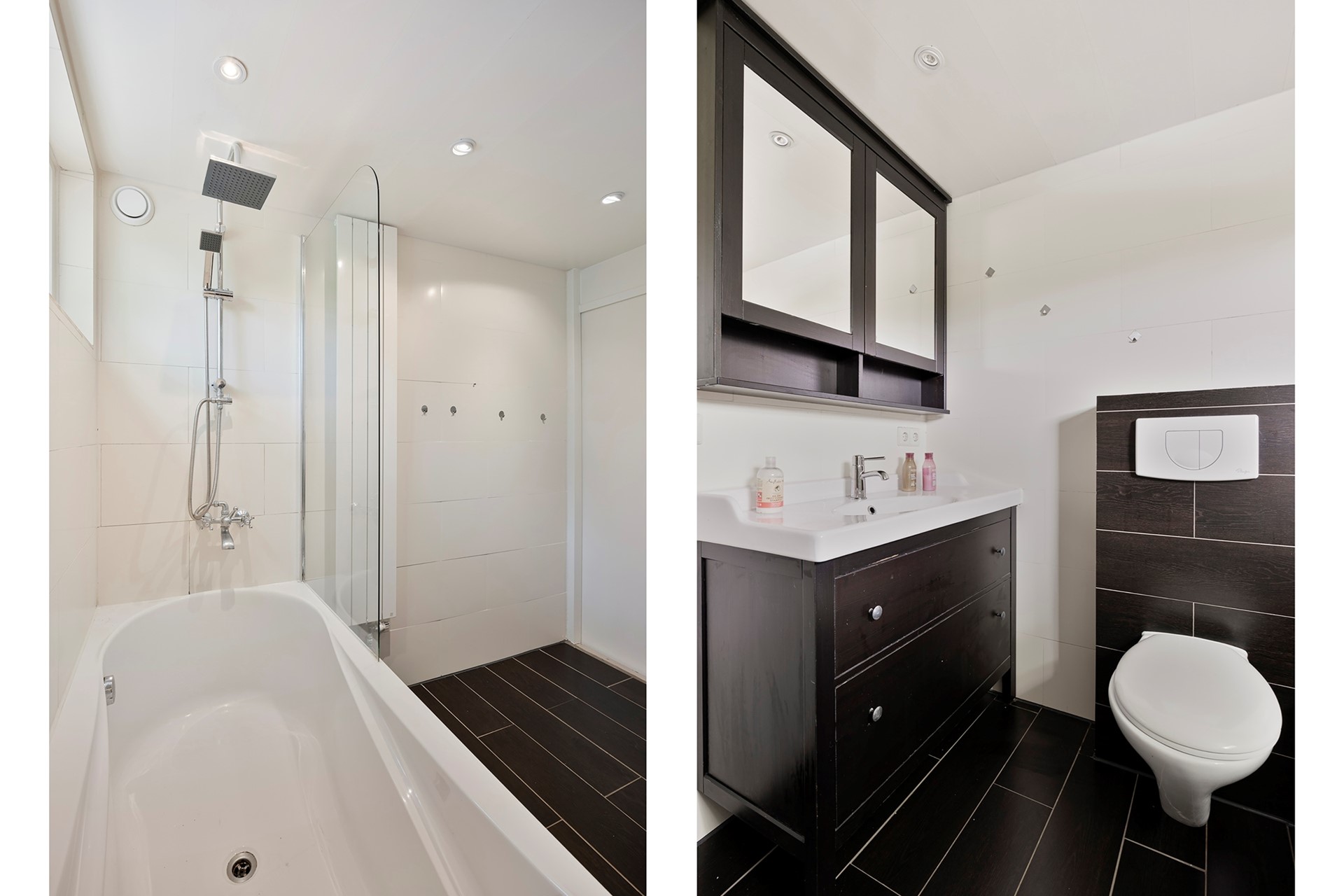 De zwart/wit betegelde badkamer is compleet ingericht met ligbad en hand/regendouche, een wandcloset en wastafel met meubel en spiegelkast. In het plafond zijn led spots aangebracht. Zowel mechanische als natuurlijke ventilatie is mogelijk in deze ruimte.