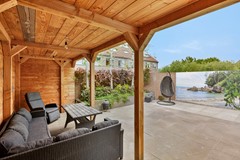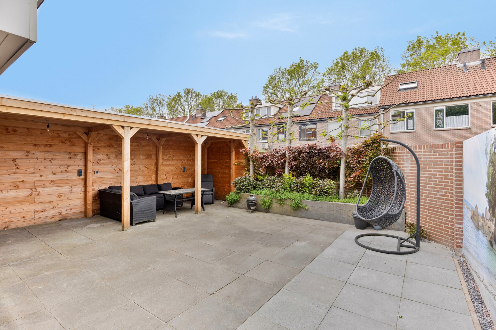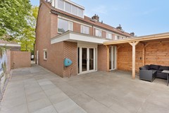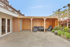 De heerlijke achtertuin op het westen is 7,5 x 7,5 meter en langs de woning heeft u ook nog eens een strook grond van 3 meter breed. Het geheel is netjes bestraat en op de erfafscheiding staat een keurige gemetselde tuinmuur (vergund/geheid). De gezellige overkapping (2024) staat garant voor menig gezellig uurtje buiten, is gebouwd van Douglas hout en er zijn diverse stroompunten aangebracht. En als u in de tuin staat kunt u zien dat de gevels er zeer netjes uit zien. Ze zijn in 2015 gestraald, gevoegd en geïmpregneerd. Op de gevel is een buitenkraan gemonteerd, altijd handig. Aan de achterzijde staan in de tuin drie grote leibomen, die zorgen voor een fijne privacy.