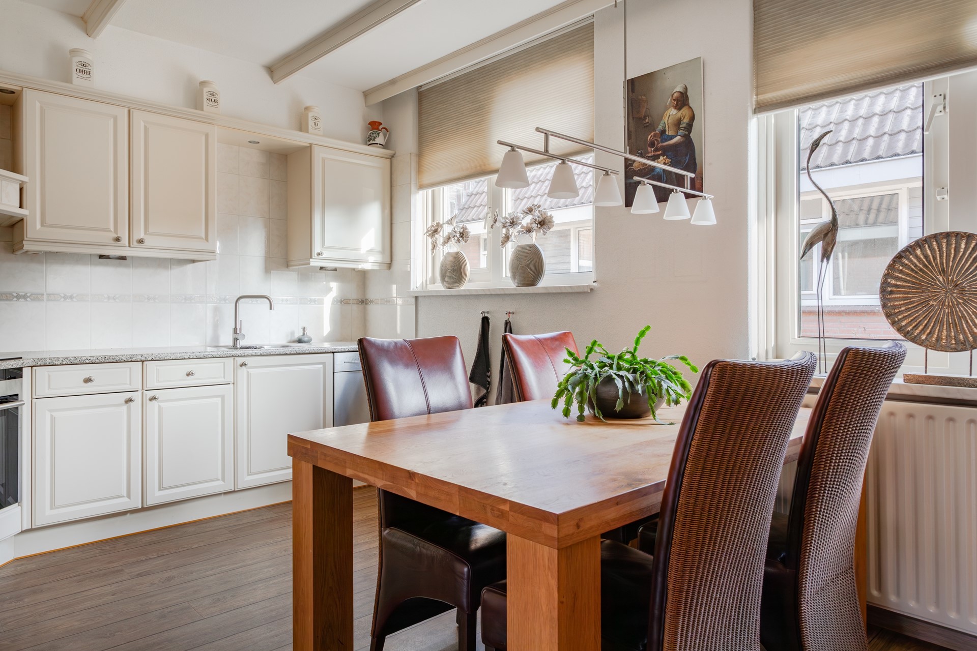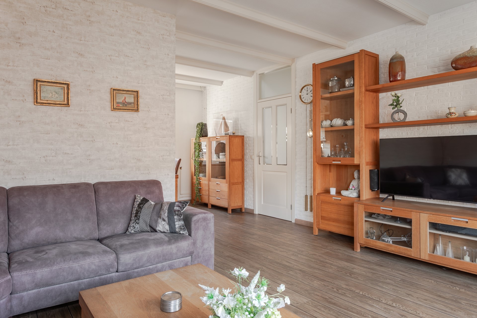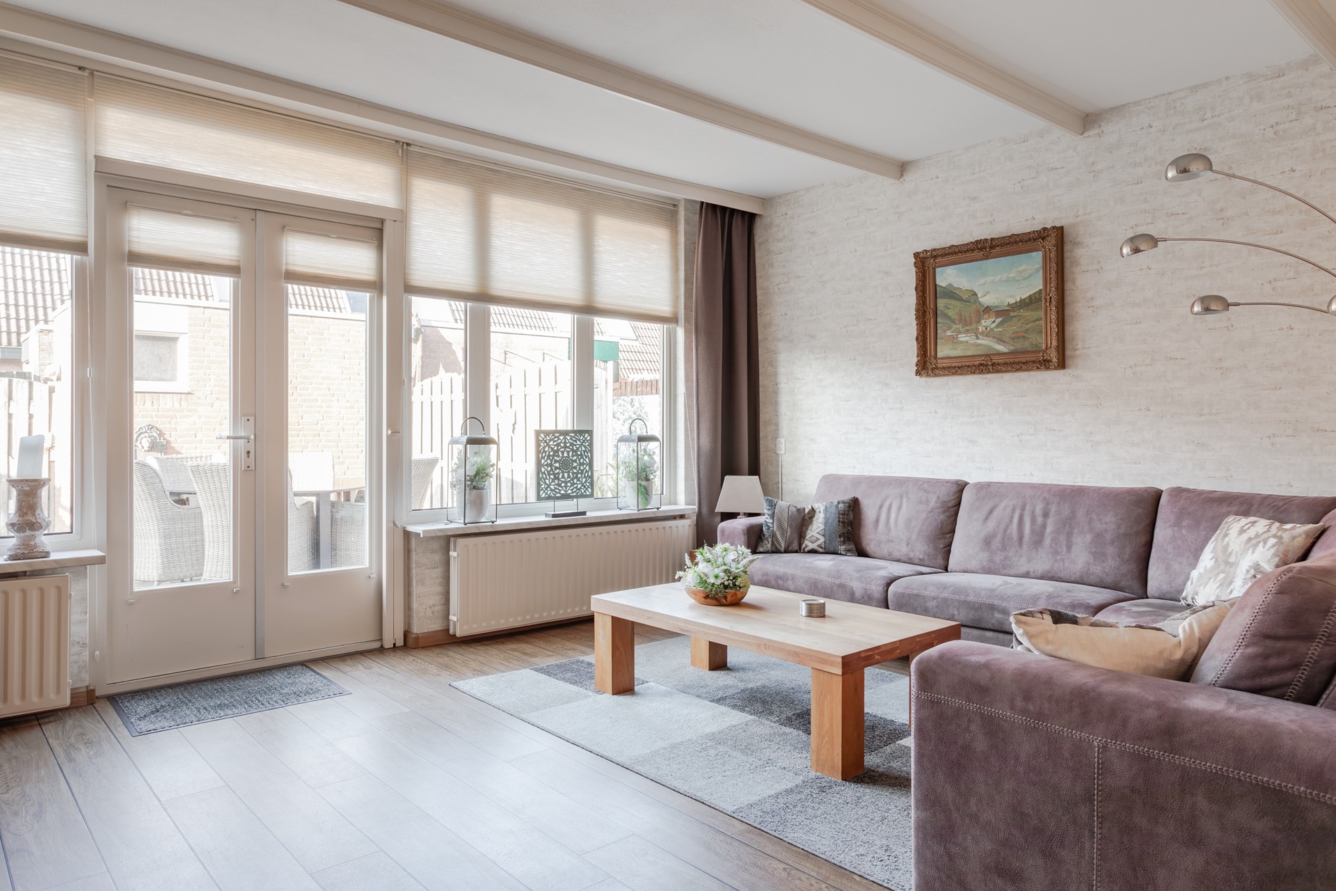 Fijne tuingerichte living met openslaande deuren en een plissé hor naar de zonnig gelegen tuin met een elektrisch te bedienen zonnescherm. De pvc-vloer is vanuit de hal doorgelegd, sierbalken tegen het plafond en 1 wand heeft steenstrips. Lekker veel lichtinval vanwege de grote raampartij met dubbel glas en boven de openslaande deuren kan een klapraam open. Radiatoren onder de brede vensterbanken verwarmen de zithoek.