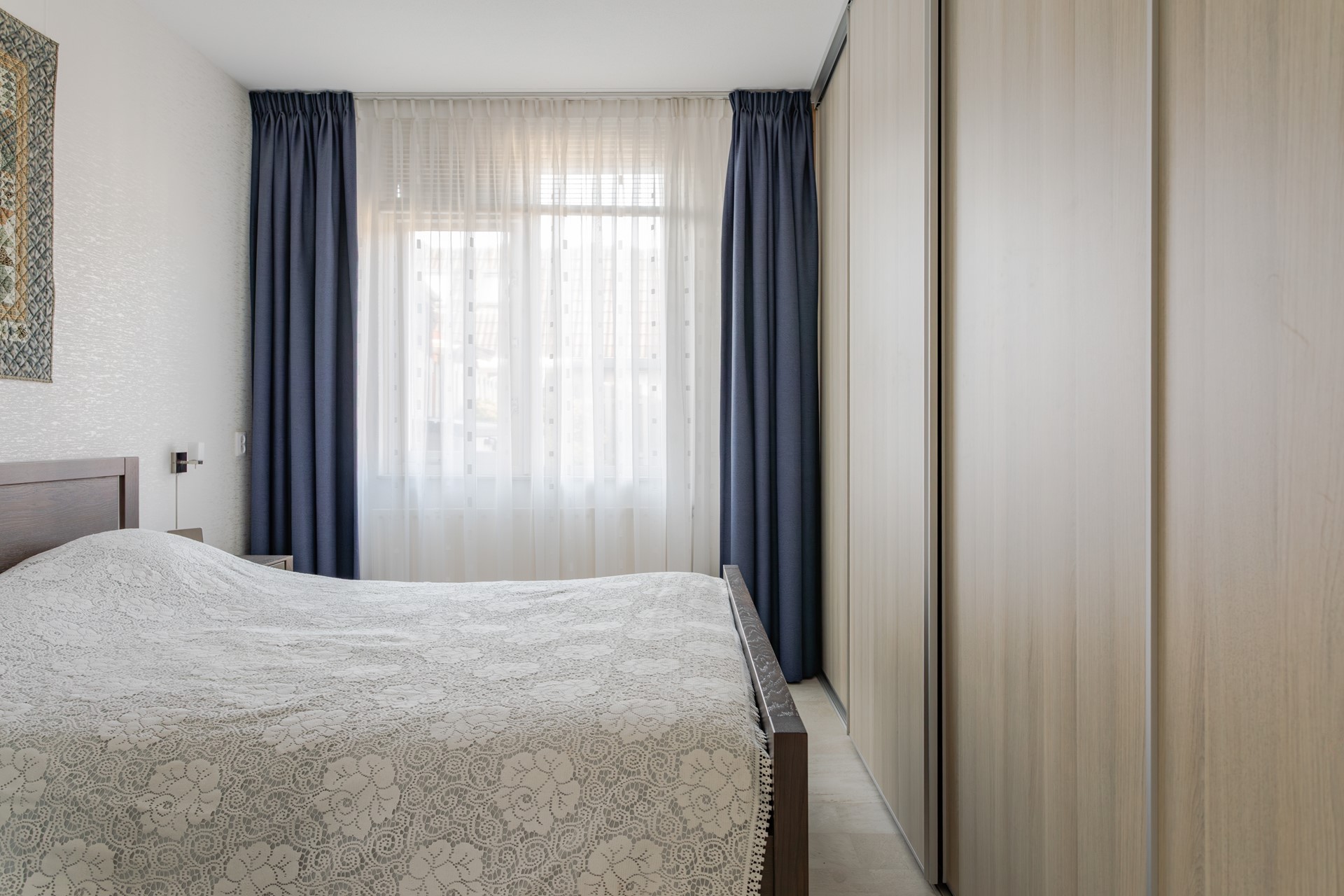 De slaapkamer op de begane grond heeft een laminaatvloer, de wanden zijn behangen en een vaste kastenwand met 4 schuifdeuren.