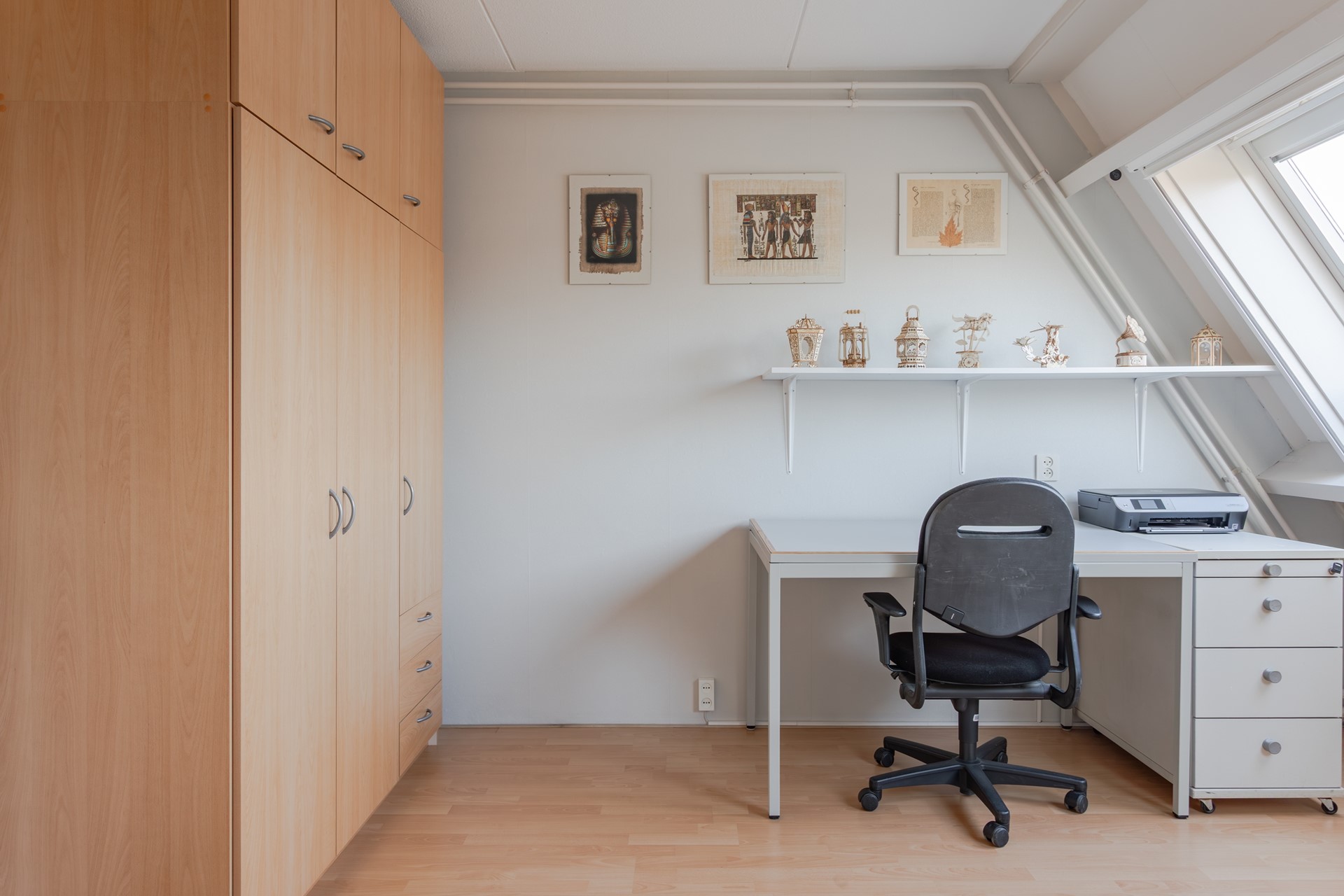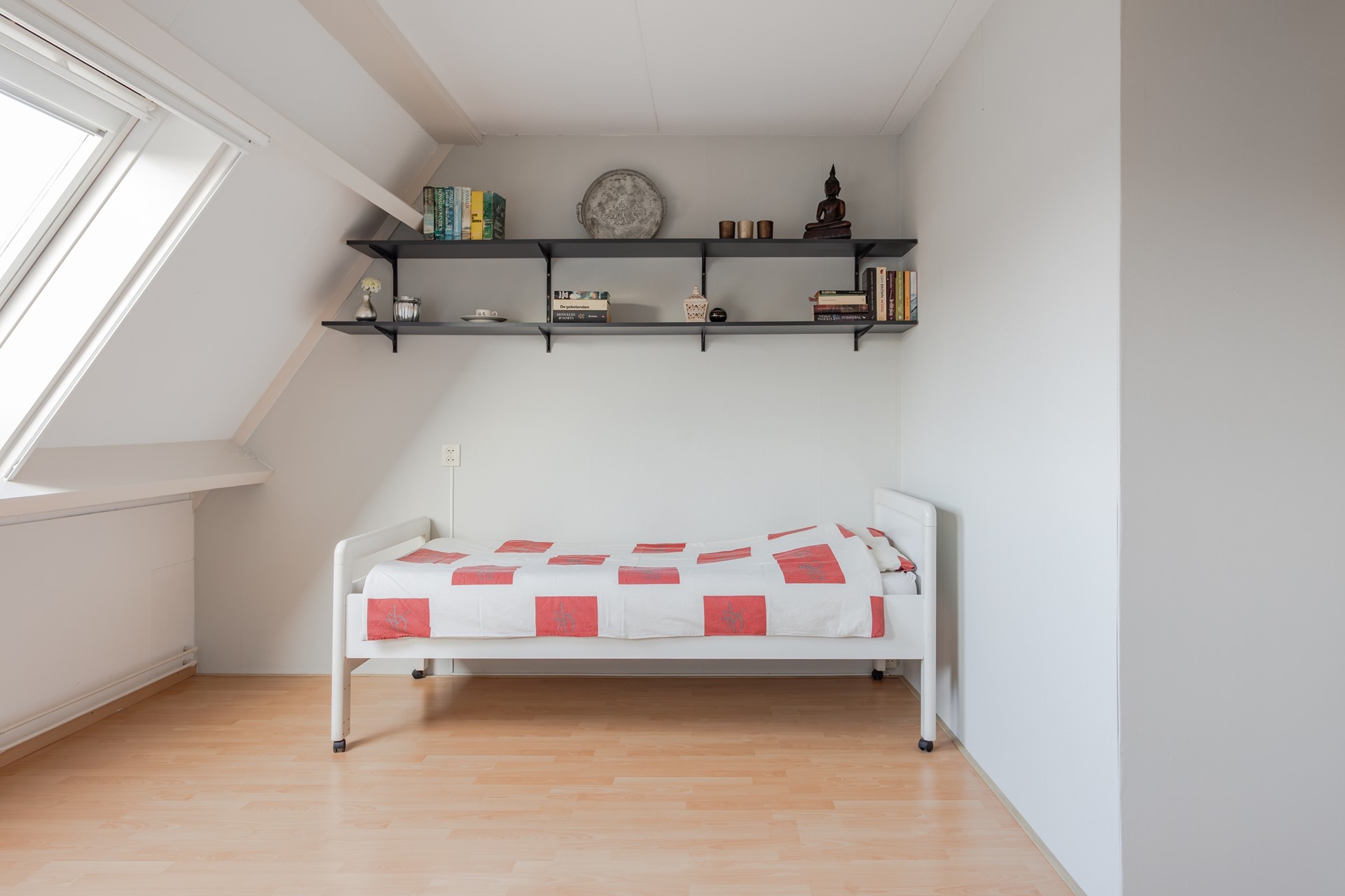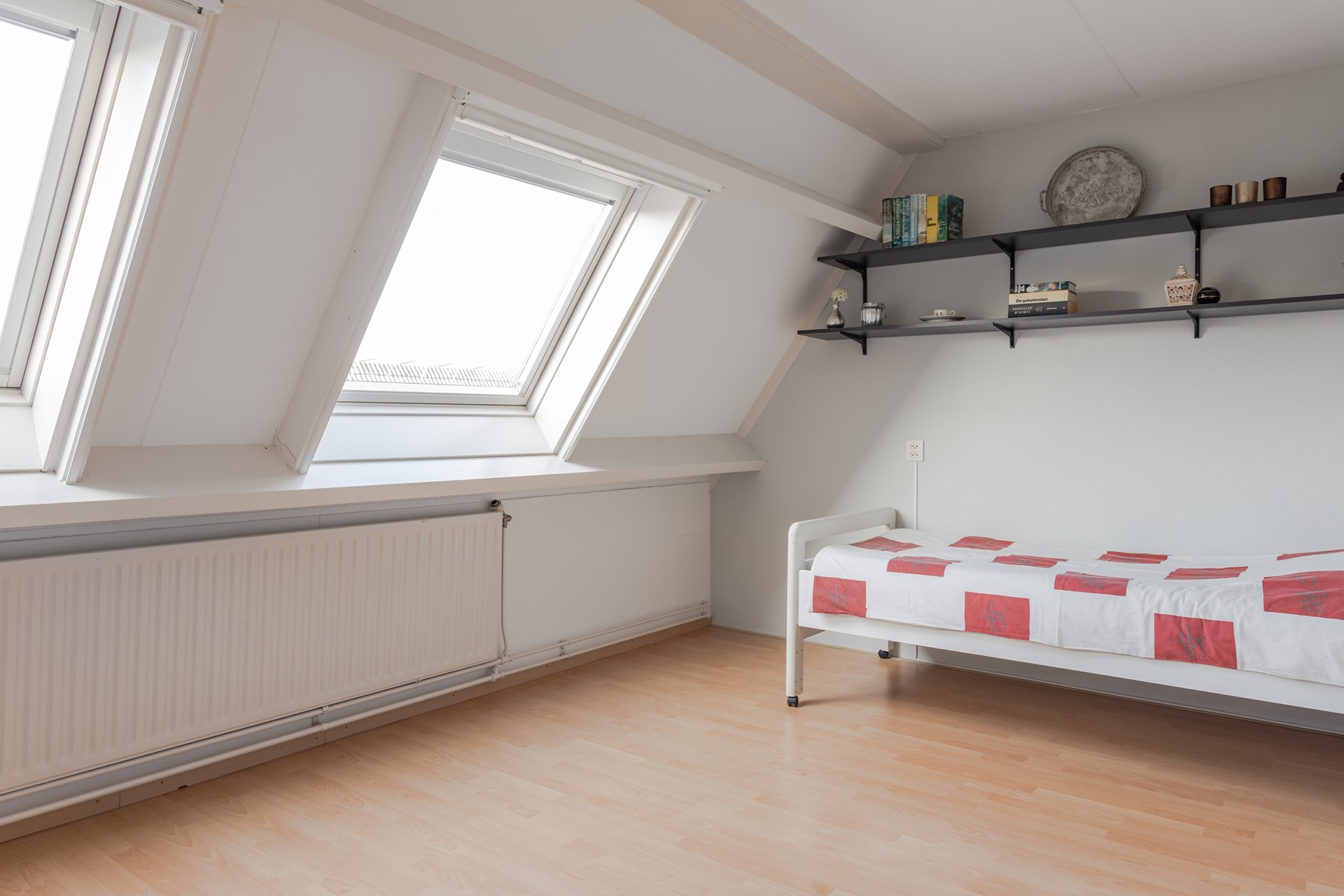 2e Slaapkamer – ruime kamer waar laminaat op de betonnen verdiepingsvloer is gelegd. In 2025 zijn de wanden stijlvol behangen en er is veel lichtinval via een groot Velux dakraam met luxaflex en een hor.