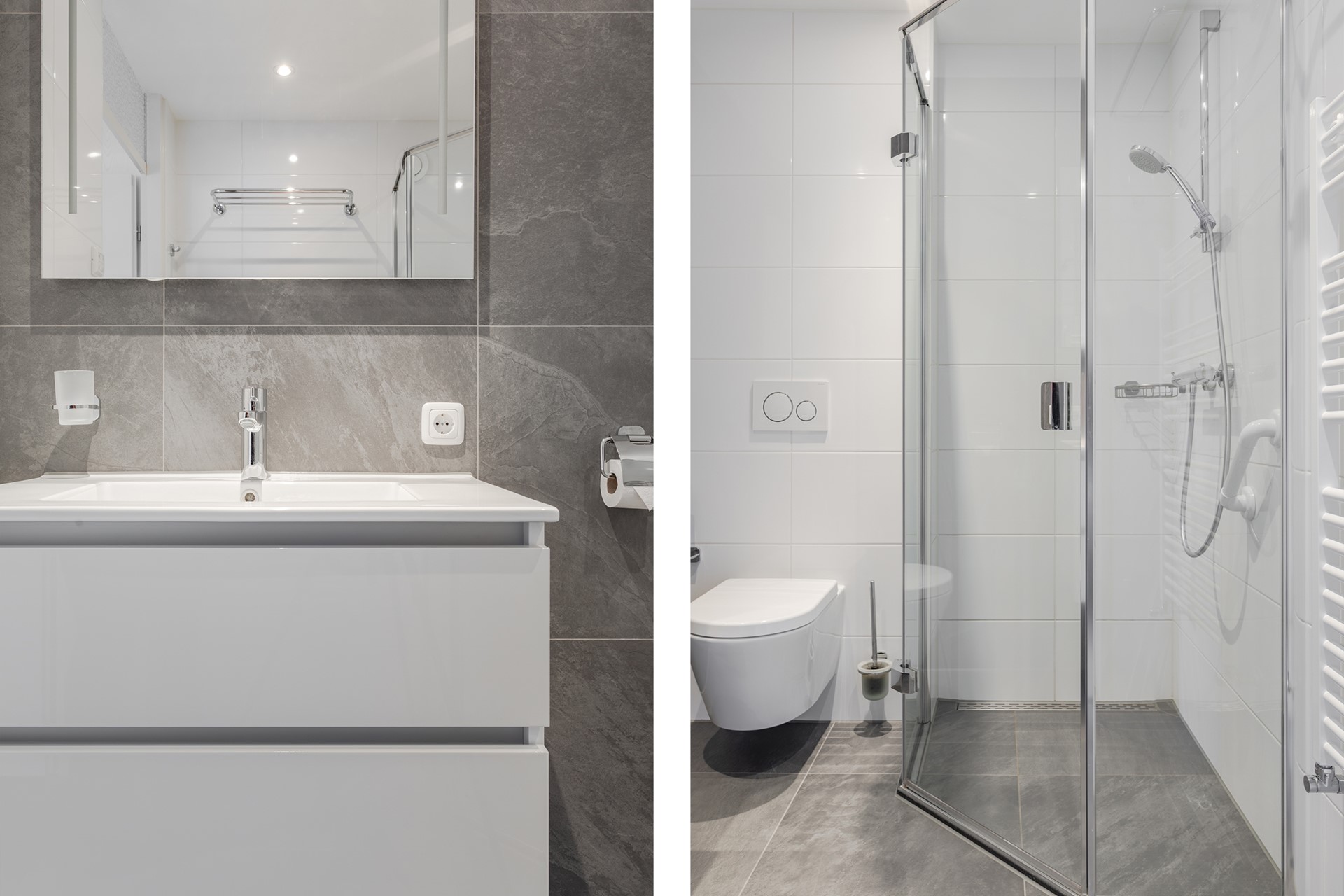 Moderne badkamer met eigentijdse betegelde wanden en dito vloer. Er is een wastafelmeubel met porseleinen wasbak met plateau’s, altijd handig om wat spulletjes op te plaatsen, spiegel met geïntegreerde verlichting, stopcontact, 2e toilet en een douchehoek met glazen deur en wanden, thermostaatkraan en drainafvoer. De badkamer wordt verwarmd door een designradiator, ook lekker voor het drogen en verwarmen van de handdoeken. Het plafond is gestuukt en voorzien van inbouwspots en er zit een centraal afzuigsysteem met de bedieningsknop in de badkamer.