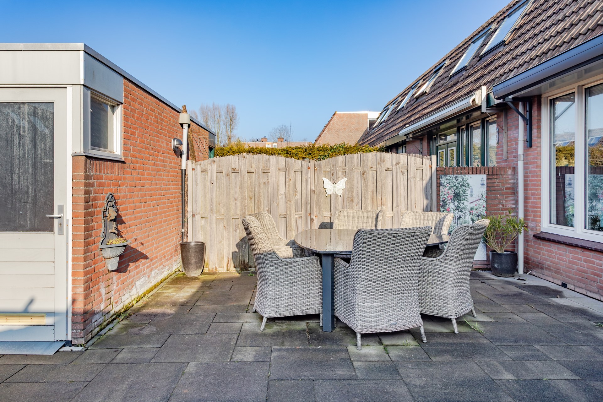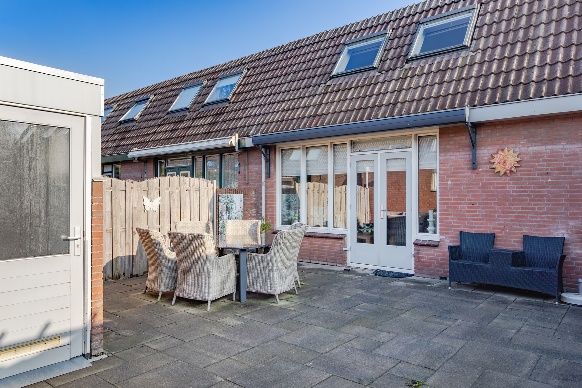 Echt een ruime tuin op het zuidwesten met een elektrisch te bedienen zonnescherm die in 2022 is geplaatst. Geen overbodige luxe want de middag- en avondzon zijn volop aanwezig in deze tuin.